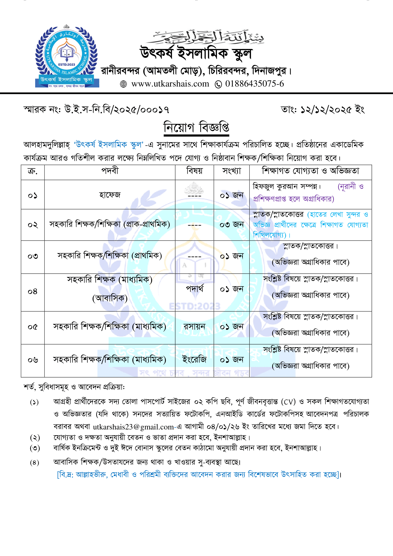 * শিক্ষক নিয়োগ বিজ্ঞপ্তি: আগামী ০৫/০১/২৬ ইং পর্যন্ত আবেদন গ্রহণ করা হবে। Details